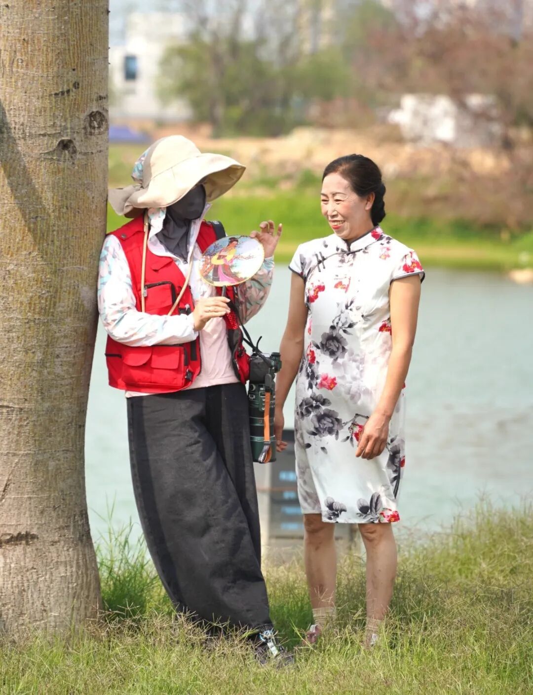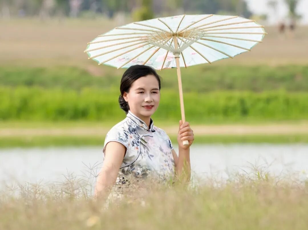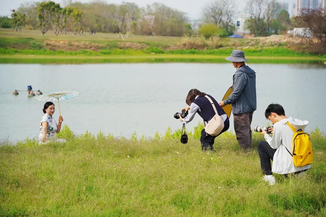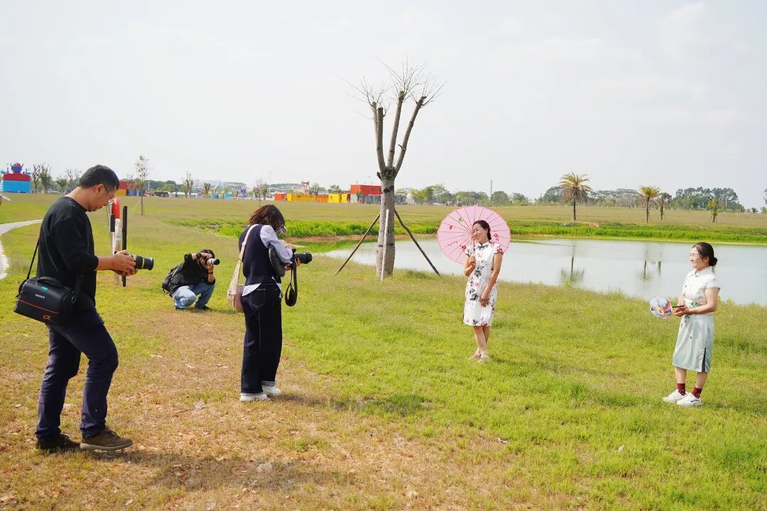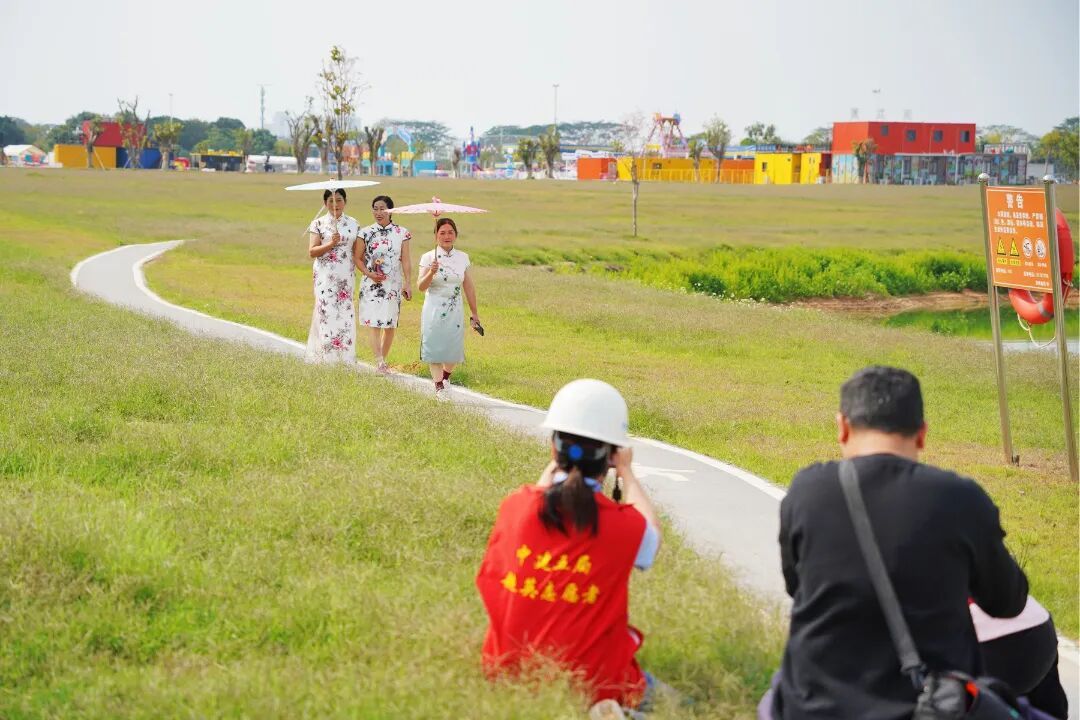 在工地前拍完工装照,换上旗袍化好妆的女工友们步行前往石排川龙埔公园的绿色大草坪上。此刻蓝天白云、碧波荡漾,在摄影志愿者的巧妙引导下,工友们或执团扇,凭栏浅笑;或携手并肩,婷婷而立。清脆的快门声连连响起,将这份从心底绽放的自信与美丽,牢牢定格。