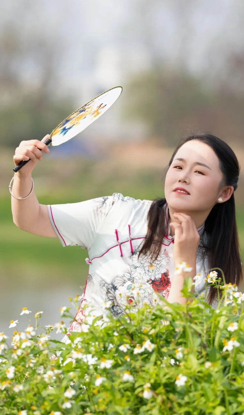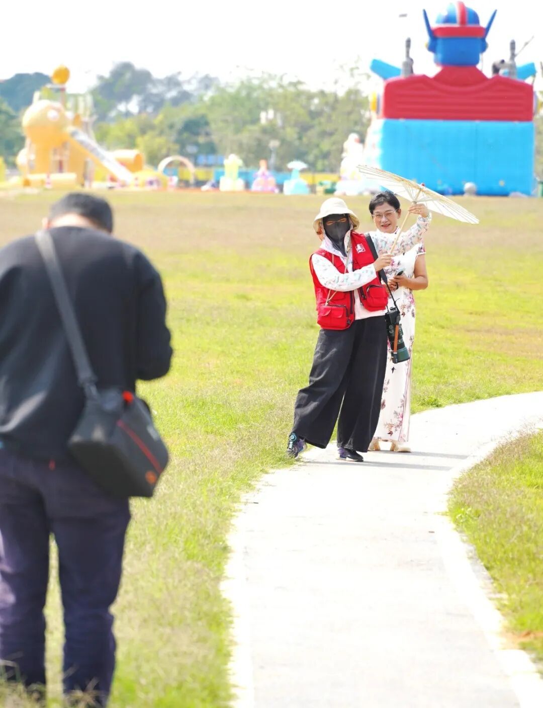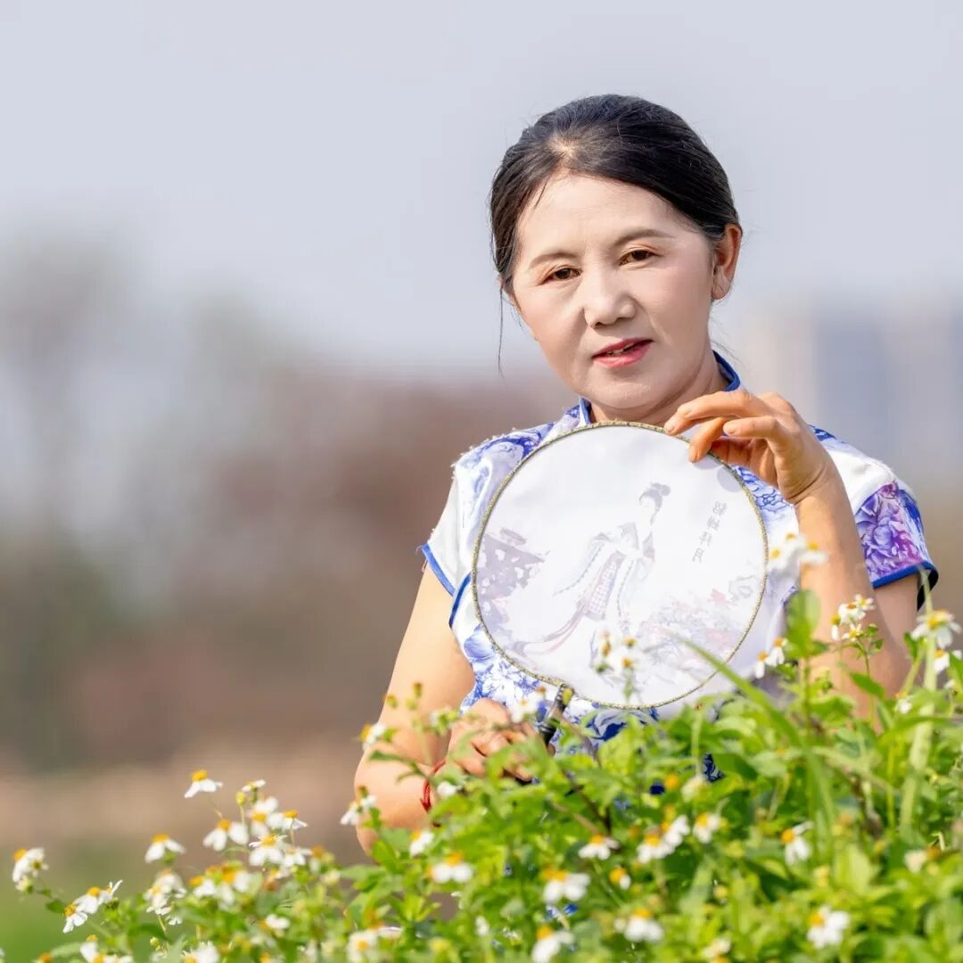 在工地前拍完工装照,换上旗袍化好妆的女工友们步行前往石排川龙埔公园的绿色大草坪上。此刻蓝天白云、碧波荡漾,在摄影志愿者的巧妙引导下,工友们或执团扇,凭栏浅笑;或携手并肩,婷婷而立。清脆的快门声连连响起,将这份从心底绽放的自信与美丽,牢牢定格。